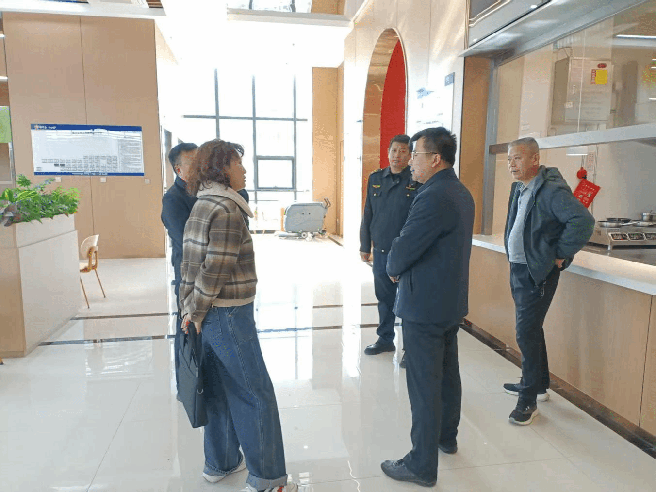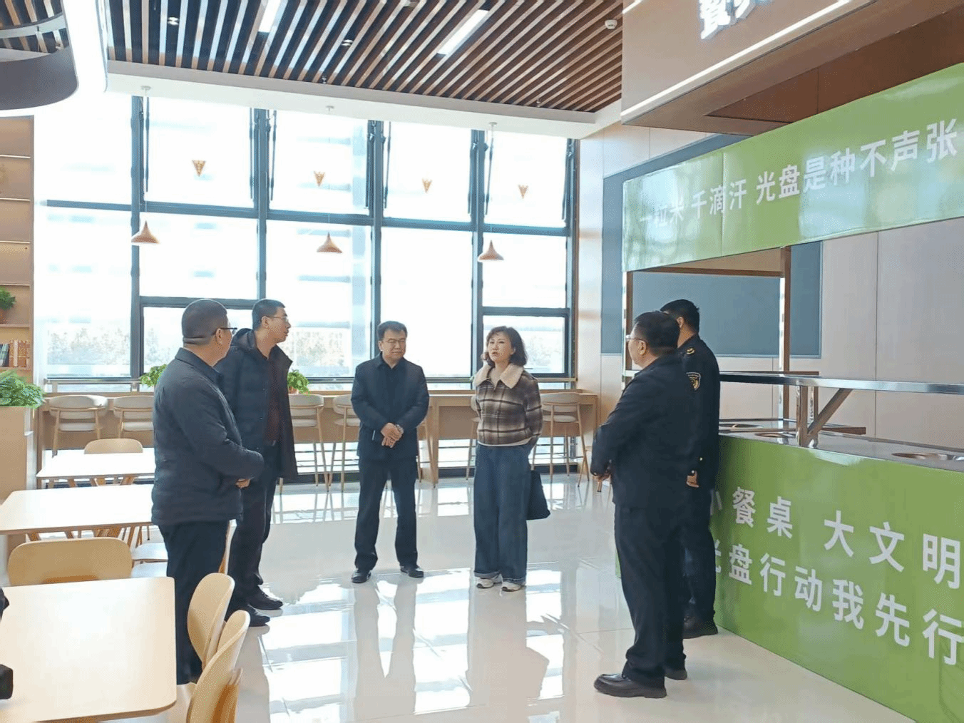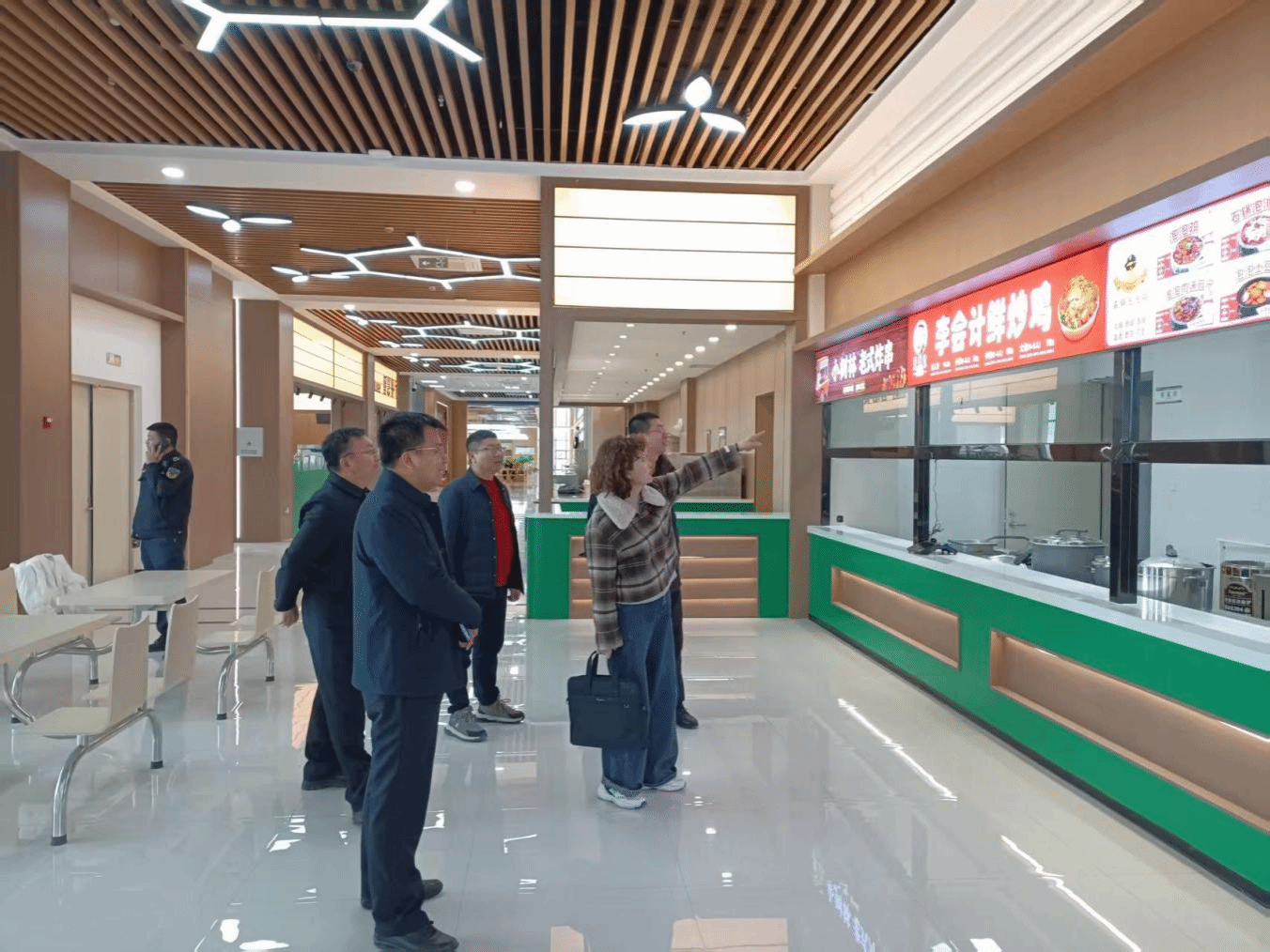 夏楠等一行深入新餐厅后厨操作间、售卖区及就餐区域,实地查看了餐厅二楼的经营服务项目设置以及加工制作场所,认真听取了关于餐厅建设规模、整体经营布局规划、设施配备及运营筹备情况的汇报,详细了解了加工流程设计及食品安全保障措施等。